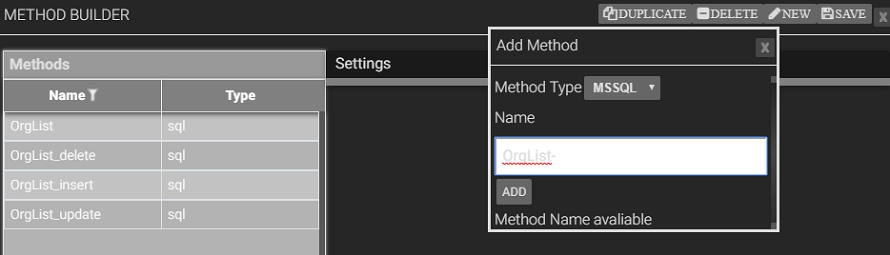When user click on new it is showing add method.In add method contain method type and name.User select the method type ,enter the name and click on add.